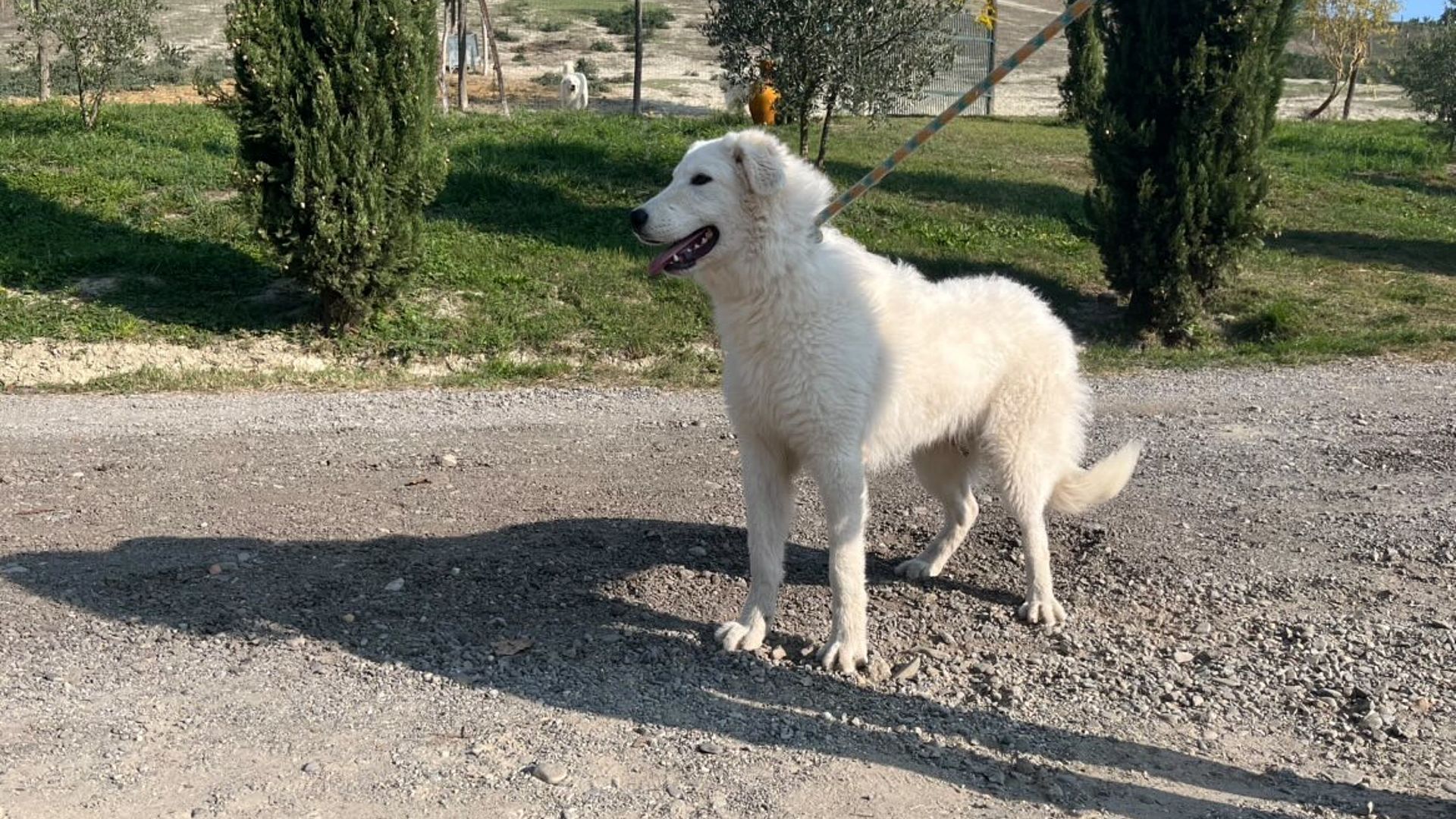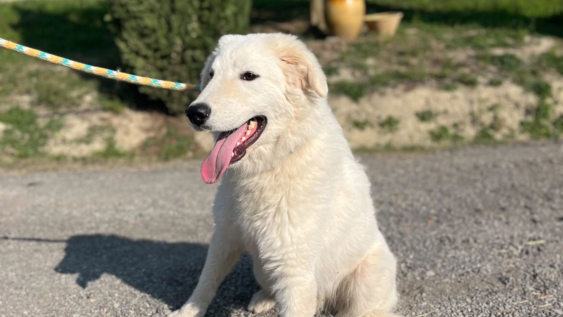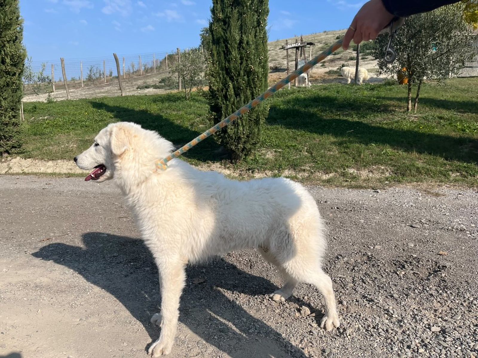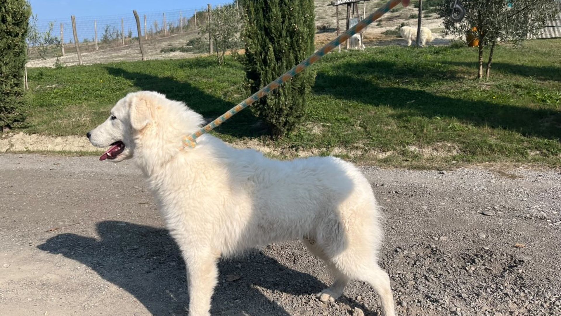 Campagnolo ist ein junger Abruzzen-Schäferhund, fast ein Jahr alt, ein großer Welpe mit Sommerfell, das weniger dicht ist als in der kalten Jahreszeit. Er hat ein korrektes und vollständiges Gebiss mit Scherenbiss, und seine Hoden sind im Hodensack abgestiegen.