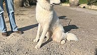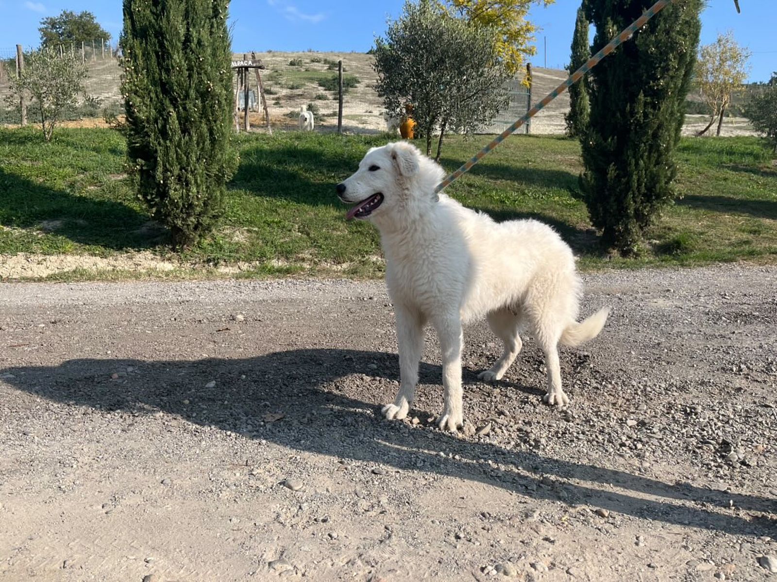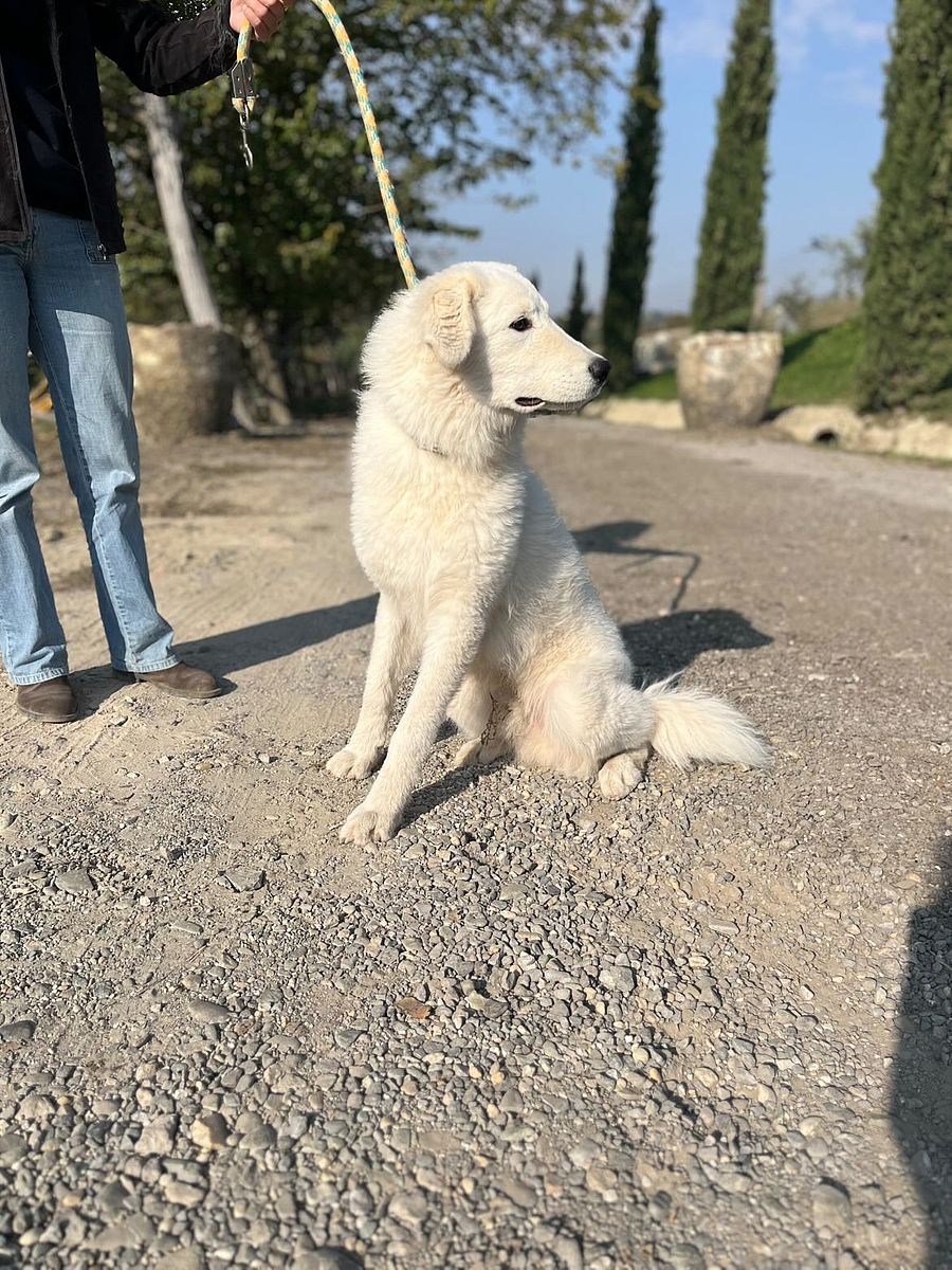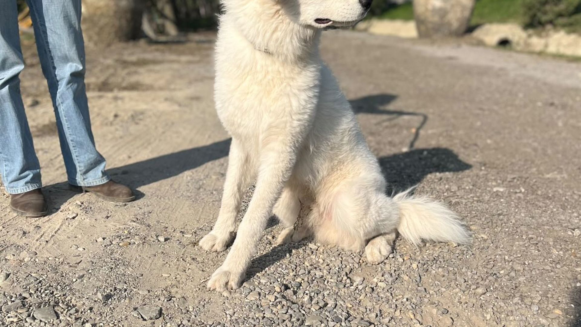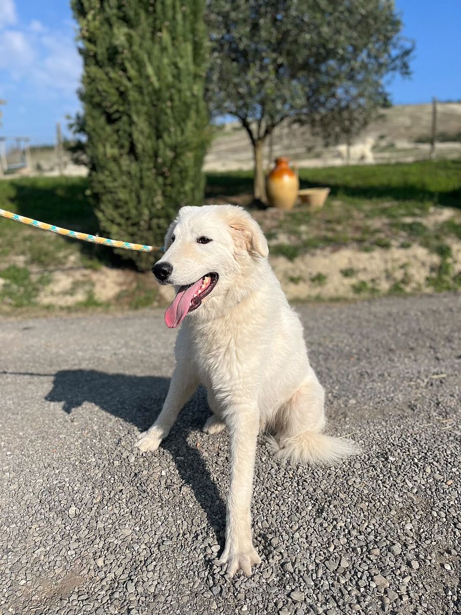 Campagnolo ist ein junger Abruzzen-Schäferhund, fast ein Jahr alt, ein großer Welpe mit Sommerfell, das weniger dicht ist als in der kalten Jahreszeit. Er hat ein korrektes und vollständiges Gebiss mit Scherenbiss, und seine Hoden sind im Hodensack abgestiegen.