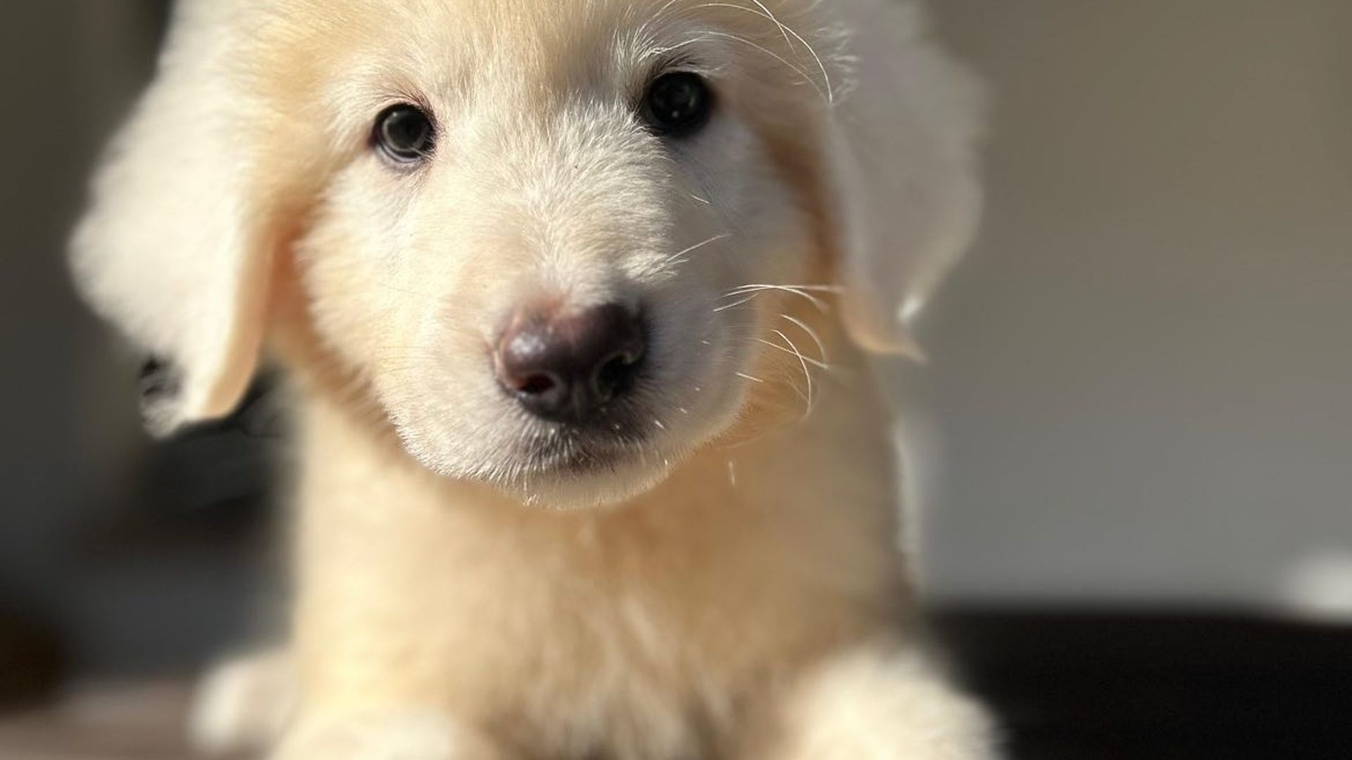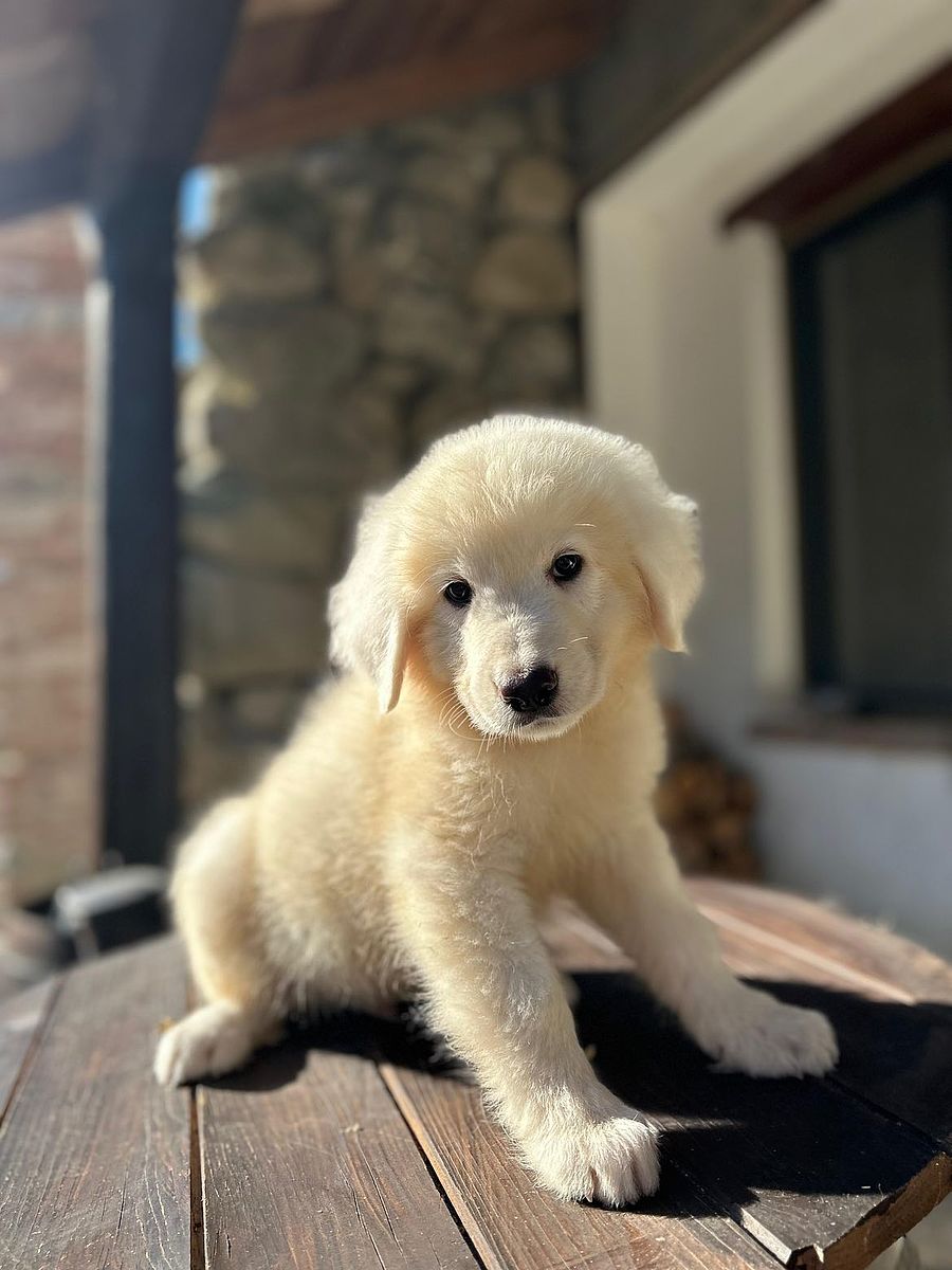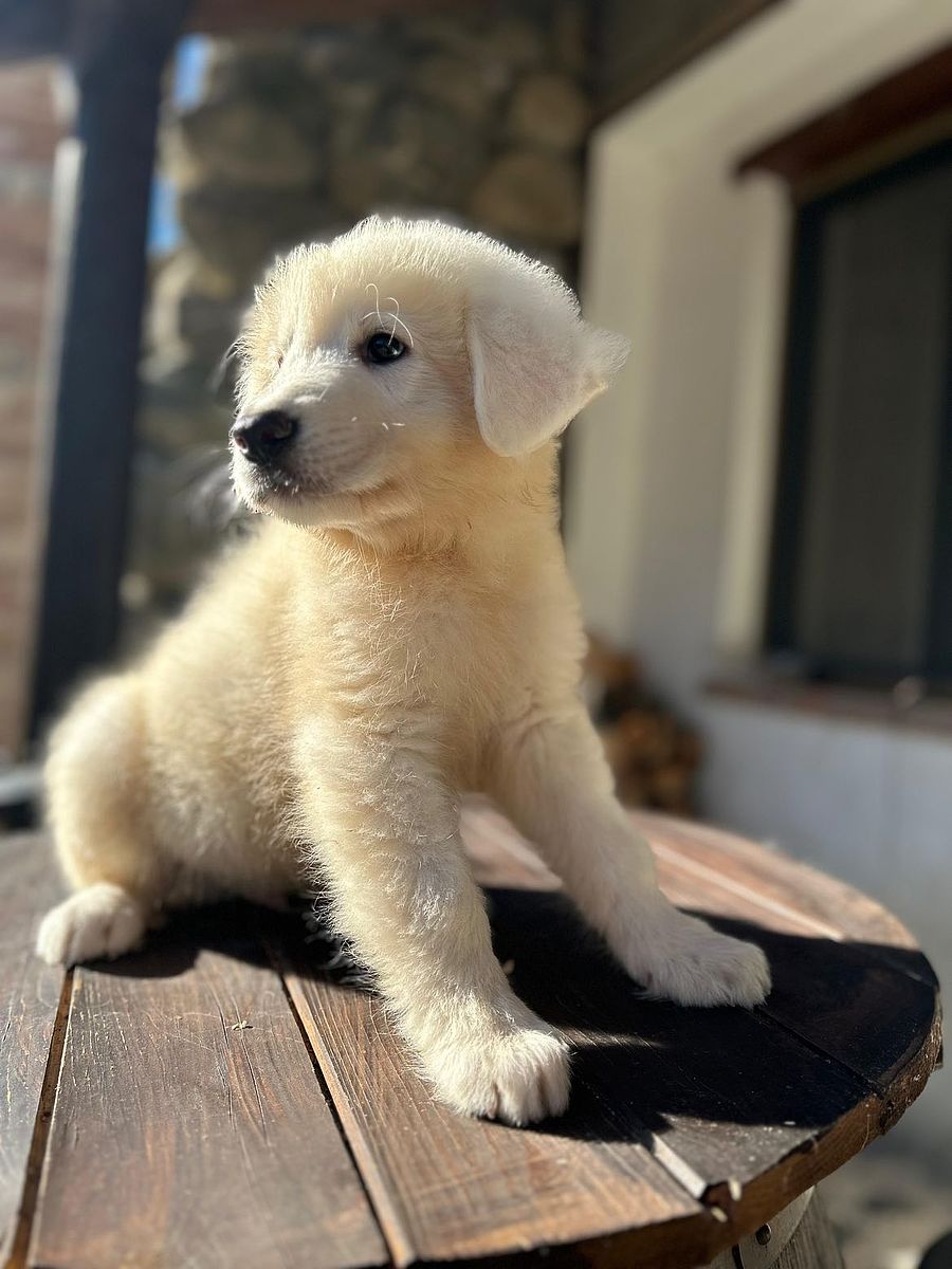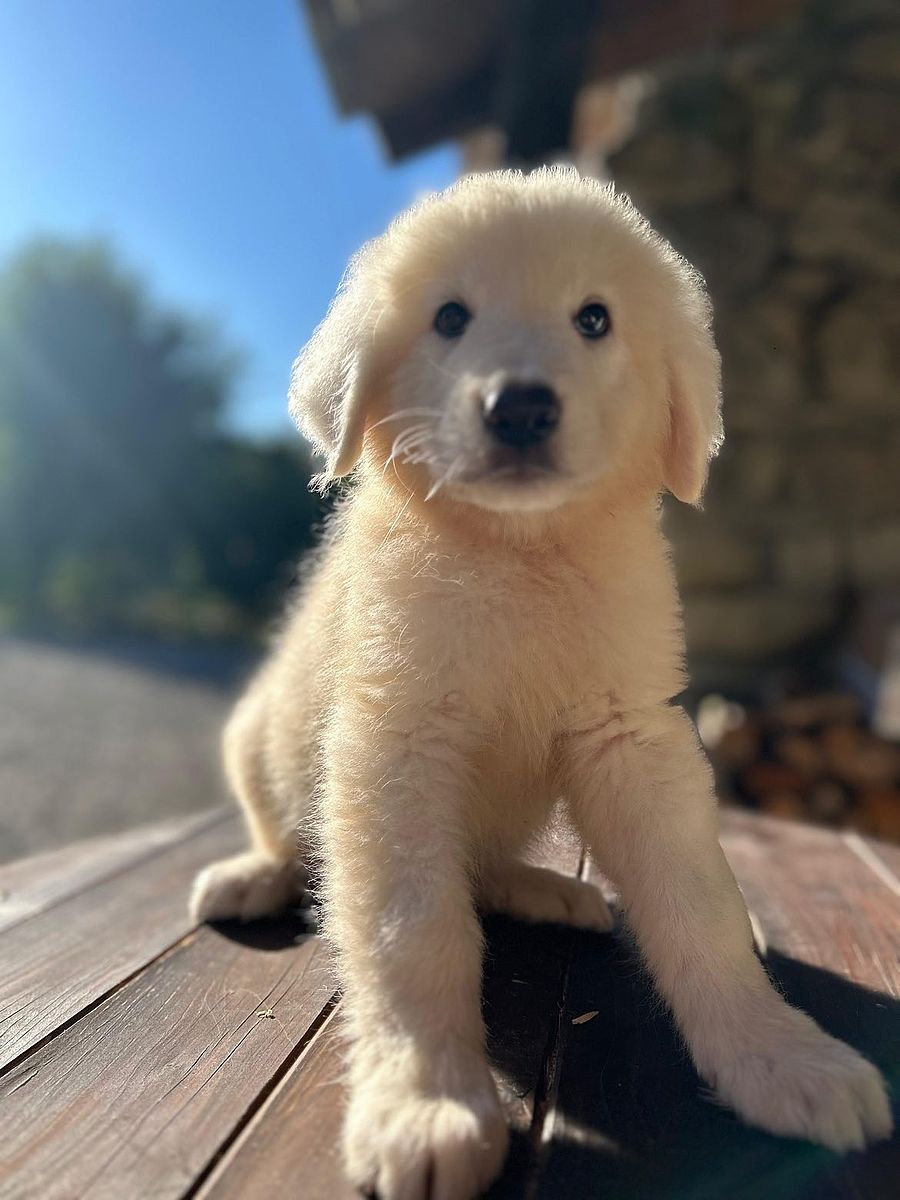 Drei Monate alter Maremmen-Abruzzen-Schäferhundwelpe, ein Exemplar von bemerkenswerter morphologischer und charakterlicher Typizität. Er zeigt eine harmonische und proportionierte Struktur, bereits robust für sein junges Alter, mit solidem Knochenbau und natürlicher Haltung, die die zukünftige Größe und Präsenz der Rasse erahnen lässt.