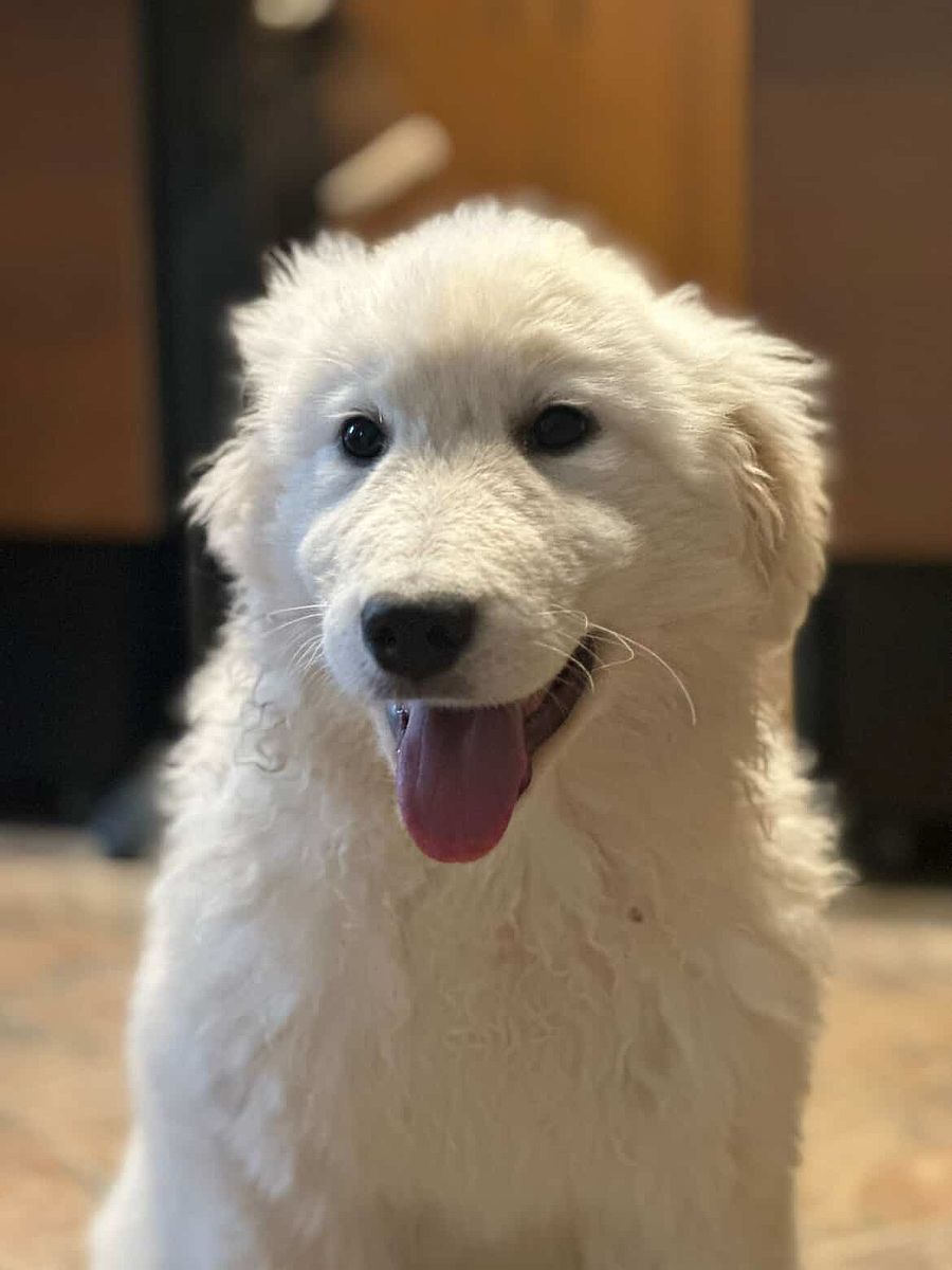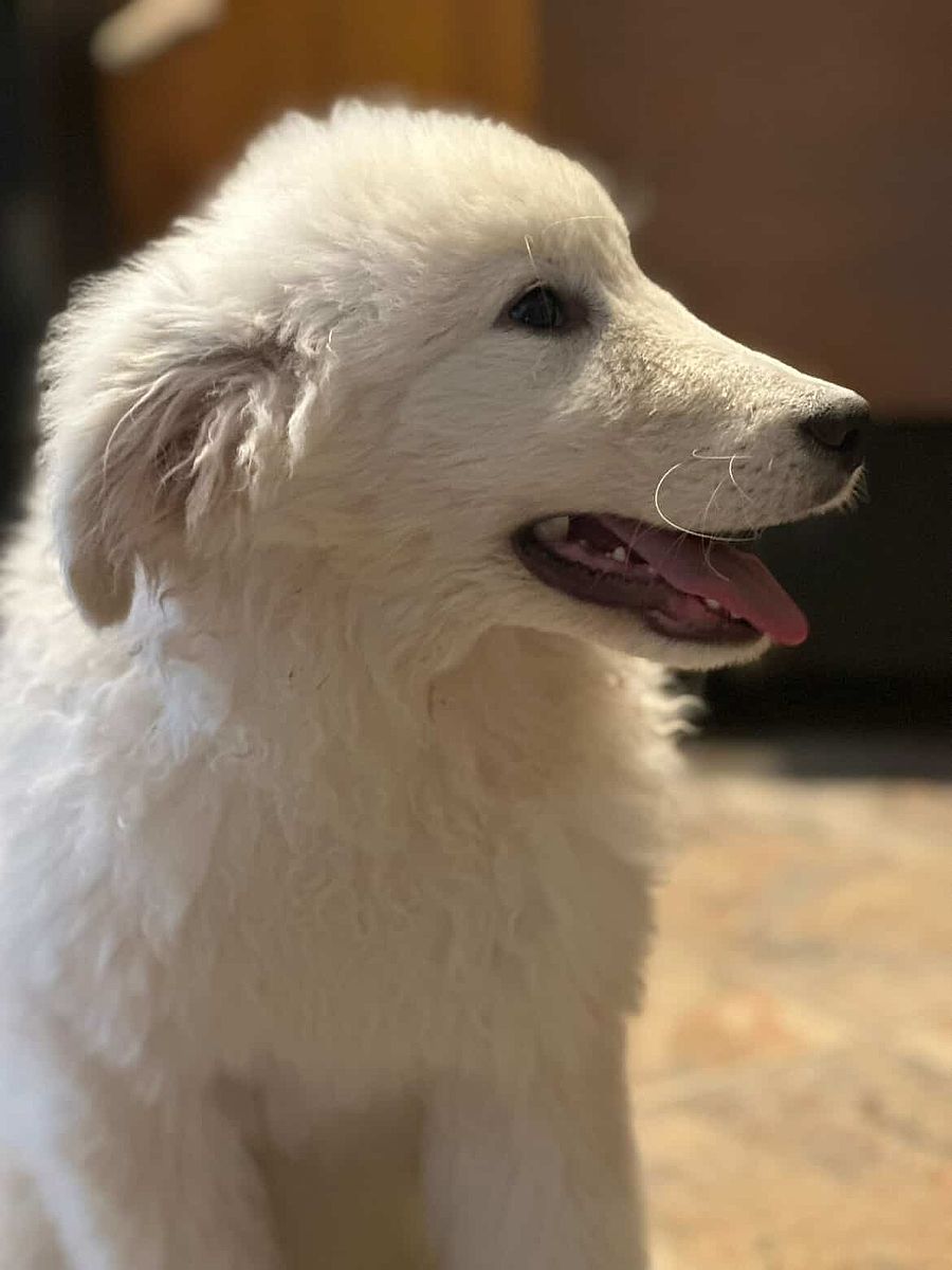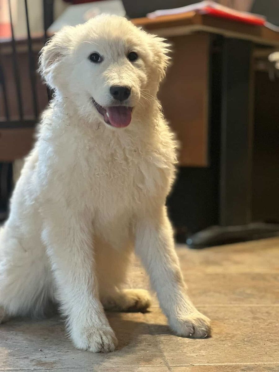Pinza ist eine Welpin des Maremmano-Abruzzesischen Schäferhundes, geboren am 10. Oktober 2025, Tochter von Melanzana, einer aufmerksamen und ausgeglichenen Mutter, und von Argento, einem kräftigen, rassetypischen Vater.
